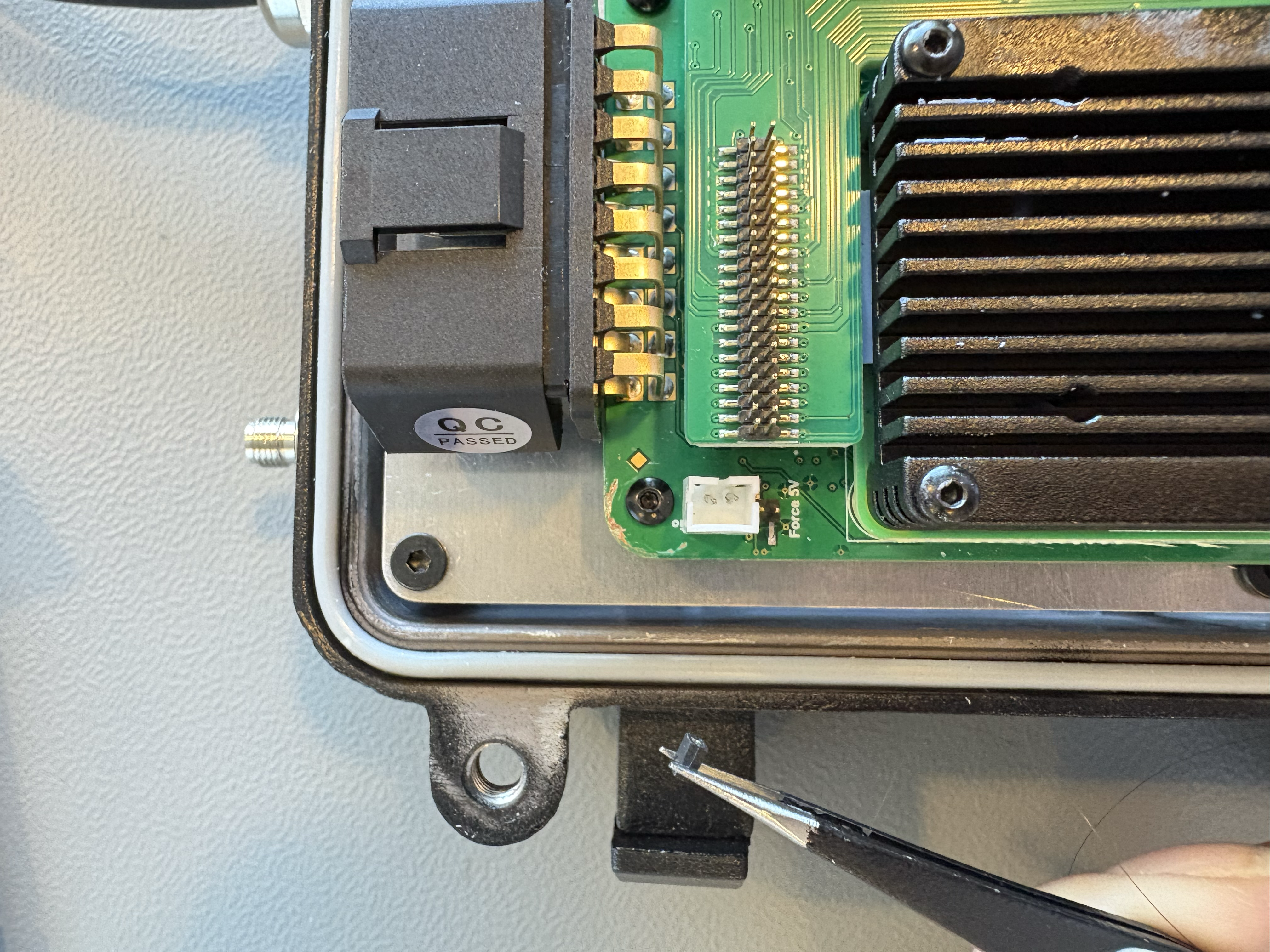 To use a jumper, you will need to open up your AutoPi device. On the inside of the device, you'll see two boards connected to each other. One of them being the Raspberry Pi and the other - the AutoPi board. On the AutoPi board, you should be able to see two pins on one of the four corners, next to which is written 'FORCE 5V'.